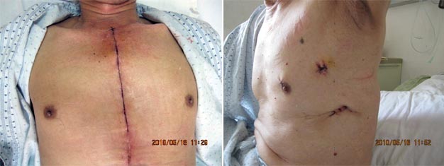 (2)食管癌微创手术:我科是较早国内开展食管癌微创治疗的单位之一,使用胸腔镜或者胸腔镜联合腹腔镜治疗食管癌,在胸、腹部只需要几个1~2cm长的小切口即可完成该手术,大大减轻了手术创伤,同时具有出血少、疼痛轻、恢复快、对心肺功能影响小、住院时间短、手术瘢痕小等优点,病人可在术后1~2天下床活动,对早中期食管癌治疗与传统手术相比显示出明显的优势,为广大食管癌患者带来了福音。