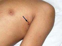 (6)手汗症:对手汗症患者采用隐蔽的两侧腋下各一个0.5cm切口施行胸腔镜下切断胸3-4交感神经,即刻解除患者手多汗,社交不便以及精神和心理障碍等,疗效显著,患者当天入院第二天即可出院。