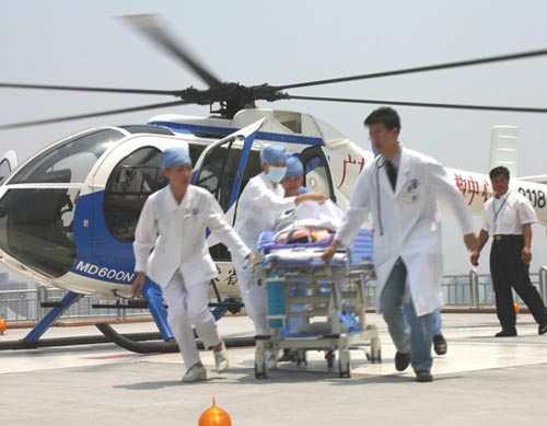 航空急救中心主要使用MD600N型直升机,时速可达240公里,飞行高度为300米,基本无气压变化,飞行非常平稳,确保不会颠簸影响患者。机舱内有急救药物和除颤监护仪、呼吸机等急救设备,并配备经过航空医学培训的急诊专业医护人员。专供直升机停放的停机坪修建在主体楼顶楼,停机坪长21.2米,宽20.8米,完全按照国际标准修建,经中央军委备案和中南民航局批准使用。医院里还专门设立了航空救护专用电梯,并且在停机坪与电梯之间修建了绿色通道。从停机坪直达医院各个危重病专业救治科室,仅需1分钟,手术室和相关医生可确保8分钟内开始手术救治。
