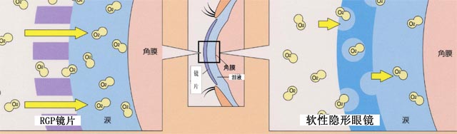 RGP即RigidGasPermeable的英文缩写,RGP隐形眼镜的中文涵义是硬性透氧性角膜接触镜。RGP硬性眼镜所含的硅、氟等聚合物,能够大大增加氧气的通过量(见下图)。与软性隐形眼镜相比,既提高了透氧性,又保证材料的牢固性,并且具有良好的湿润性和抗沉淀性。