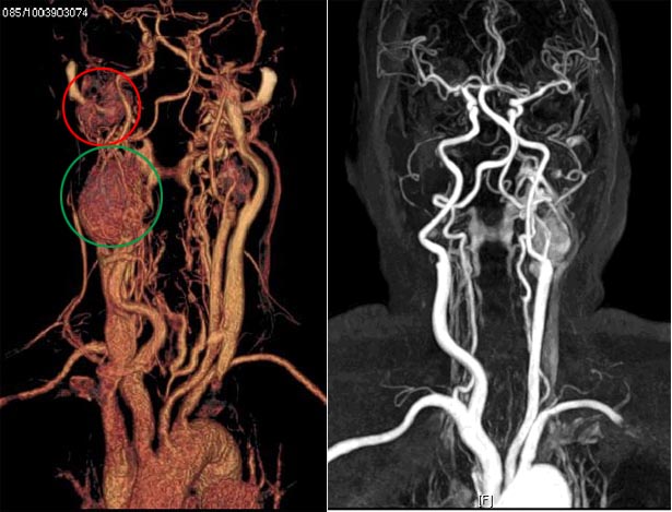 颈动脉球瘤和颈静脉球瘤都是临床上非常罕见的肿瘤,而如果发生在同一患者身上,那就更为罕见了。而近日我院耳鼻咽喉-头颈外科就遇到了这么一例患者,竟然患了双侧颈动脉体瘤和单侧的颈静脉体瘤。