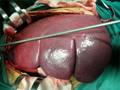 主刀的刘宇斌主任医师介绍说,肝血管瘤如果位于肝脏边缘区,则很容易受外力撞击破裂或自行破裂而引起大出血甚至危及生命,一般血管瘤超过6-8厘米就应该尽快手术,该患者血管瘤达20x25厘米才来医院手术,实在相当危险,随时都有破裂的危险。