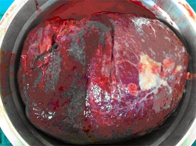 男孩患有淋巴瘤多年,脾脏越长越大。由于脾脏实在太大,走遍多家大医院,均不敢为小伙子实施巨脾切除术。但随着脾脏日渐增大,腹部逐渐膨隆,犹如怀孕的妇女,给学习和生活带来很多不便。男孩家人心急如焚,后经熟人介绍,入住我院血液科,并转入肝胆胰外科。主诊医生刘宇斌主任医师仔细分析患者病情后决定为患者实施巨脾切除术。手术过程顺利,出血甚少,切除的脾脏竟有55x50厘米大,重量达16斤(如图)。手术后病人犹如减肥成功,体重下降了近20斤,一下子又恢复了16岁男孩应有的健康体型,患者及家属满怀感激之情出院了。