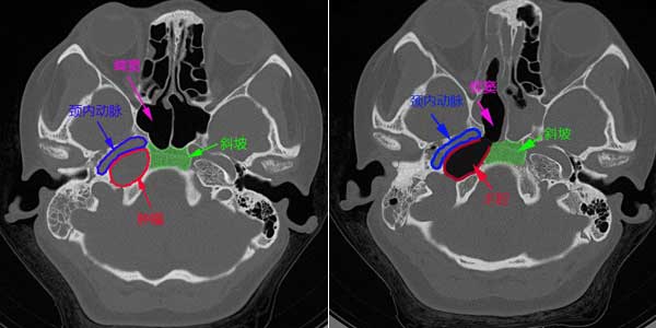 通过文献检索,国内外尚无鼻内镜下经蝶窦斜坡进路的报道,此为首例。而该手术方式术式较其它方式具有微创、可监控又不骚动颈内动脉的优点,为颈内动脉后方外的岩骨部病变微创手术切除,提供了一种崭新的、更为安全的手术进路。