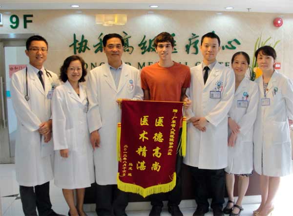 将病人送入手术室后,协和医生们刚要松一口气时,一份来自检验科的报告让他们的神经又绷紧了:患者血型是A型RH阴性血!RH阴性血非常稀有,被称为“熊猫血”,我国只有不到1%的人群为Rh 阴性血,这意味着病人输血存在很大的难度。这时手术正在紧张进行中,麻醉后患者血压一度骤降至70/25mmHg,并发现胸腔内积血1200ml,急需输血。饶主任立刻致电保健部客户管理科请求帮助,客管科负责人在最短的时间内和输血科叶汉深主任联系上并说明情况,叶主任一边指导可用自体血回收机给患者回输自体血,一边同时派车从中心血站调血。短短30分钟后,4个单位珍贵的A型阴性血送到了手术室。这时,大家高悬的心才缓缓放下。术后在陈刚主任及协和二区全体医护人员的精心护理下,MAAROUF BAGHDADI恢复极快,小伙子的父亲对医院、协和病区表示万分的感激,从一开始的无助、惊慌到后来的亲切、安心,这都有赖于省医专家精湛的医术,丰富的急危重症救治经验和对危急情况的快速反应。MAAROUF BAGHDADI出院时在病区意见调查表上写下了这样一段发至肺腑的话: I really appreciate the english language skill of most of my nurses. In China, it is rare to find english speakers and in my situation. They were excellent !【我非常欣赏大多数医务人员的英语能力。在中国,处于我这种情况下很难找到能用英语沟通的人。他们真的很棒!】