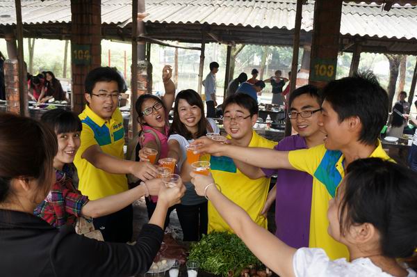 联谊活动首先在大学城的浪漫双人自行车项目中拉开序幕。男女按号配对骑车,在充满绿意又幽静的大学城绿道上开始了浪漫的邂逅之旅。最精彩热闹的要数中午的野炊活动——“厨艺大比拼”了,大家分成8个小组,男女随意搭配,按提供的相同材料做出各具特色的菜肴,然后进行大比拼。真可谓是男女搭配,干活不累,只见各组员分头行动,分工合作,会烧菜的主动担起主厨的重任,不会做饭的洗菜烧火,一时间柴烟、油烟四起,锅碗瓢盆叮当响,奏响了一曲厨房狂欢曲,大伙忙得不亦乐乎。黄船的小伙子非常勤快,烧火切菜样样抢着干,而省医的姑娘也不甘示弱,纷纷拿出看家本领,一展厨神风采。一个小时不到的工夫,各小组都做出了十几道色、香、味俱全的菜肴,而且各有创意,最出人意料的是他们用铁锅煮的饭,居然也能烧出电饭煲的效果,真是令人惊叹:原来这群80 后接近90的孩子,并不是像人们说的娇生惯养,他们也出得厅堂,入得厨房!大家在洗菜做饭的过程中,一下子拉近了距离,并在分享劳动成果中加深了彼此的认识。