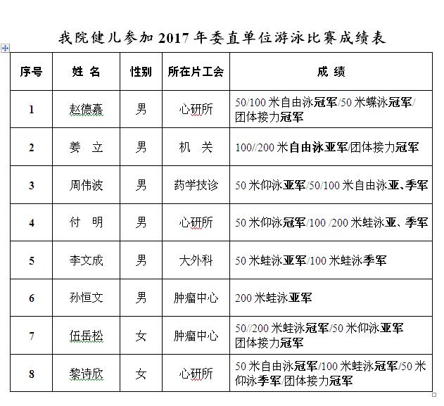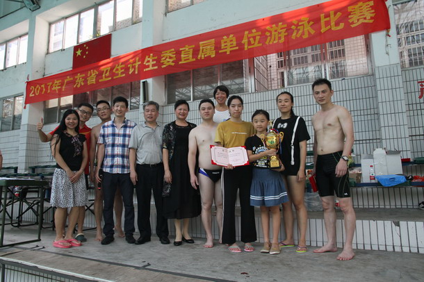 为推动全民健身运动的广泛开展,由省卫生计生委工会主办,我院工会承办的“2017年广东省卫生计生委直单位游泳比赛” 于7月28日下午在广州军体院游泳馆成功举行。本次赛事共有13个单位近100名运动员参加。省卫生计生委巡视员、直属机关党委书记、工会主席刘银燕、工会副主席廖俐珍出席活动并为个人和集体项目前三名颁发了荣誉证书和奖杯。我院工会副主席王铠率领我院10名游泳健儿参加本次比赛。经过两个半小时的奋力拼搏,我队共获得14个项目的9个冠军、8个亚军和4个季军,为医院赢得了荣誉。