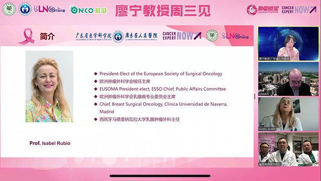 Rubio教授担任欧洲乳腺癌专业委员会现任主席、欧洲肿瘤外科学会候任主席,她就“乳腺癌前哨淋巴结活检技术最新进展” 进行了主题演讲,良医汇、ONCO前沿等多个直播平台同时在线,单个平台在线观众超过6万人次。在主题演讲中,Rubio教授对前哨淋巴结活检技术要点进行了生动的讲解、介绍了用于标记前哨淋巴的示踪剂的最新进展以及应用规范,同时对目前尚有争议的“新辅助治疗后前哨淋巴结活检”话题汇总了最新的循证医学证据、就“如何降低前哨淋巴结活检假阴性率”这一难题进行了全面梳理,指出除了依靠“双示踪剂、切除前哨淋巴结数目≥3枚”的传统方法外,还可借助精准靶向切除前哨淋巴结(Target Axillary Dissection, TAD)技术进一步降低前哨淋巴结活检假阴性率,进一步丰富了“前哨淋巴结活检技术”的内涵。最后,Rubio教授对前哨淋巴结活检技术的未来发展前景进行了展望,指出将在“用最小有效的手术干预实现最优的治疗结局”的道路上继续扬帆远航。在直播中,《廖宁教授周三见》平台的常驻国际知名专家——美国国立综合癌症网络(NCCN)乳腺癌临床实践指南主席William Gradishar教授和国际前哨淋巴结协会(ISNS)主席Charles Balch教授也进行了热烈讨论。