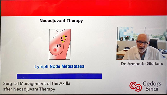2021年2月3日,乳腺科邀请全球乳腺疾病诊疗领域顶级专家Armando Giuliano教授到《廖宁教授周三见》平台授课。在这周的线上教育项目中,廖宁教授团队先对3例难治性乳腺癌进行了国际会诊,美国国立综合癌症网络(NCCN)乳腺癌临床实践指南主席William Gradishar教授对全球顶级肿瘤学专家的会诊意见进行了详尽解读,为患者带来了国际先进的治疗方案。随后来自西达-赛奈医疗中心的Armando Giuliano教授给大家带来了一场“乳腺癌新辅助治疗后腋窝外科处理”的主题演讲,良医汇、ONCO前沿等多个直播平台同时在线,单个平台在线观众超过7万人次。
