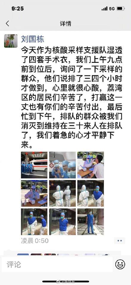 广州战疫【他湿透了4套手术衣 却为排队的群众心酸】广州本土病例再现,各医院医护们又冲在了第一线,他们顶着30多度的烈日,为市民做核酸检测,甚至通宵达旦地工作,也无怨言,却还心系着市民们,省人民医院的刘国栋发了这样一条朋友圈,感动了众人:“今天作为核酸采样支援队湿透了四套手术衣,我们上午九点前到位后,询问了一下采样的群众,他们说排了三四个小时才做到,心里就很心酸,荔湾区的居民们辛苦了,打赢这一仗也有你们的辛苦付出,最后忙到下午,排队的群众被我们最后维持在三十来人在排队了,我们着急的心才平静下来。”