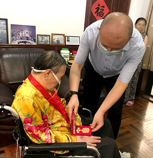 在党的百年华诞到来之际,为及时传达党中央及上级党委、医院党委对党员同志们的关怀,医院党委何斌副书记和院纪委严晋书记走访慰问了我院50年党龄以上和离退休患重疾老党员,给他们送去党的关怀和温暖,并代表院党委向老同志致以崇高敬意和亲切问候。随同慰问还有院工会邓南副主席、离退休人员服务处李嫩柳处长、离退休党总支陈剑书记等同志。