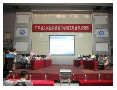 2012年10月11日下午四点,为迎合医院等级评审工作,丰富职工的业余生活,我院肿瘤中心开展职工知识竞赛,以肿瘤中心党支部(部门工会)为单位组队,分成4支队,每支队由6个人组成,共24个人参加比赛。