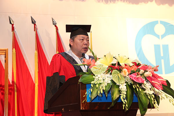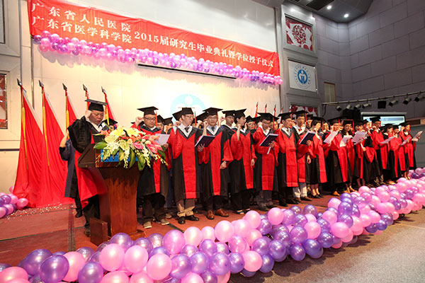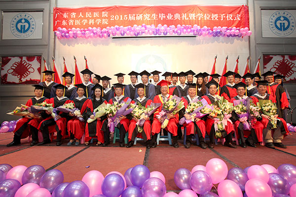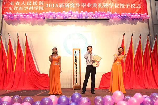 学位授予仪式在“蛇杖”的引领下,伴随全体导师列队入场的矫健步伐,在全体学生掌声雷动中开启序幕。首先由学位管理委员会主任委员吴一龙副院长通报了我院目前研究生培养的基本情况。医院目前有422名研究生在读(全日制313名,在职博士+同等学历申硕109名),博士生导师42名,硕士生导师167名。分布在我院60个二级科室,成为医院临床、科研工作的重要力量。2015届毕业研究生共127名(22名博士、105名硕士),来源于心研所、南方医和汕大医、广州中医药大学。其中,心研所:博士8名,硕士16名;南方医:博士14名,硕士65名;汕大医:硕士23名;广州中医药大学,硕士1名。全院共有15名博士和15名硕士,发表44篇SCI论文,总IF为105.16。发表SCI人数,较14届增加15%。发表SCI篇数,较14届增加33%。总IF值较14届增加21%。研究生们的论文产出,构成医院整体科教产出的重要部分。