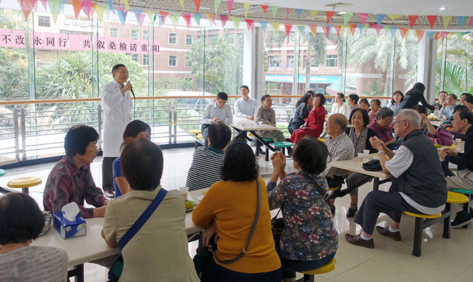 如果说尊老是中华民族千年的传统美德,那么重阳敬老则凝聚了中华民族千秋万代“老吾老”的浓浓深情和生生不息的民族风范。老人家们退休后生活、身体怎样?他们对单位发展有什么好的建议,这些都让广东省心血管病研究所在职的领导和职工牵挂不已。10月18日,乘十九大召开的东风,心研所在职工饭堂二楼召开了一次主题为“初心不改永同行 共叙桑榆话重阳”的离退休职工座谈会。院长庄建、党委书记耿庆山、副院长吴书林、心研所所长陈寄梅、副所长张智伟以及医院部分职能部门领导和心研所部分中层干部参与了座谈会,会议由心研所党总支书记李肖环主持。