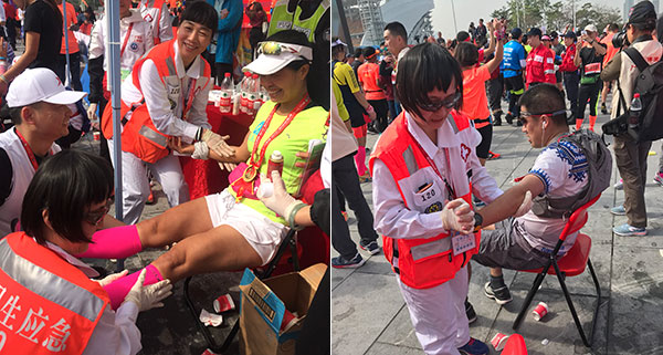 医疗队在凌晨5点就已集中整装出发,准时到达指定区域设立医疗保障单元时,天还没亮。医疗保障对象除了参加广马的运动员,还包括了现场的媒体人员、志愿者、组织方人员、运动员亲友团成员和前来观赛的民众等。今年我院固定医疗点共诊治185人,大多数为肌肉痉挛,其中还外伤和胸闷。这些伤者都得到医疗保障队的快速和妥善处理。