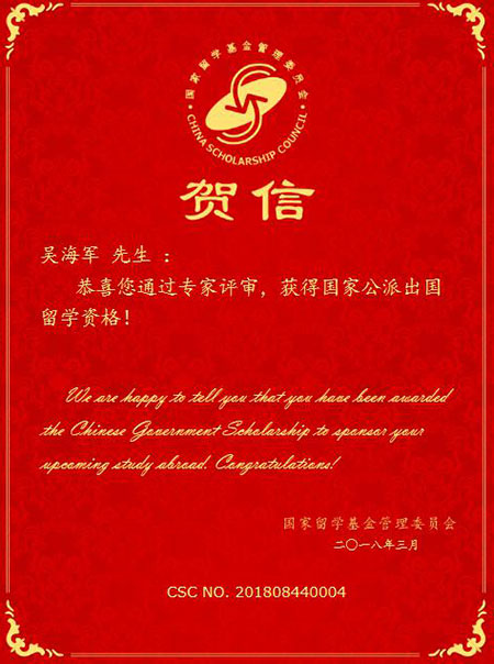 此次申请国家留学基金委的项目,吴海军博士先后高分通过了雅思及WSK考试,其中雅思阅读接近满分,达到了国家留学基金委及医院外派学习的要求。