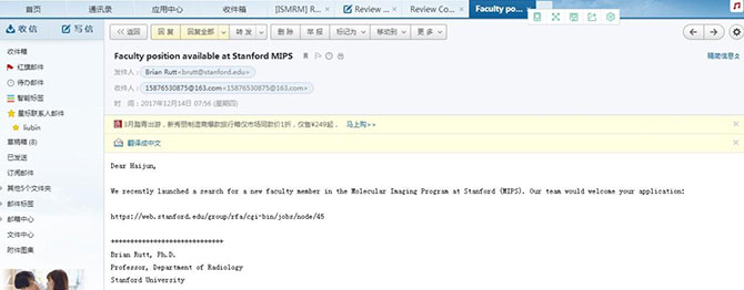 早在2016年,我院放射科吴海军博士受邀加入了国际医学磁共振学会(ISMRM),该学会汇集了全球磁共振研究领域最杰出的专家学者,每年的ISMRM年会更是盛况空前,邀请业内顶级大咖发言及汇报MRI研究的最新成果。2016年以来,吴海军博士连续3年受邀为ISMRM年会摘要审稿,2017年受邀参加第25届ISMRM年会并做大会发言。会后同ISMRM前任主席,英国卡迪夫大学的Derek Jones教授及美国斯坦福大学医学中心放射科分子影像项目 (Molecular Imaging Program at Stanford, MIPS) 实验室的负责人Brian Rutt教授就MR分子影像及功能成像研究方面进行了深入交流,Brian Rutt教授当即表达了想邀请吴海军博士去斯坦福大学开展研究的意愿,并于会后主动发来了邀请信。