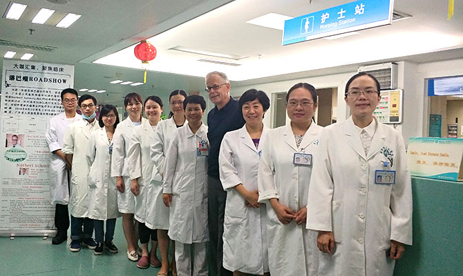 为进一步实现这一目的,同时促进国际交流。8月3日,淋巴瘤邀请德国汉堡Asklepios医院教授Norbert Schmitz共同查房。Norbert Schmitz教授是德国高危非霍奇金淋巴瘤研究小组共同主、WP淋巴瘤-T细胞淋巴瘤分会主席,在2000-2014期间担任JCO编委,已发表文章400余篇。