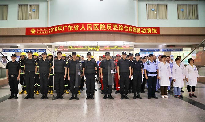为增强我院安保人员的反恐实战意识,强化警医联动机制,提高安保队伍应对突发事件的处置能力,9月22日上午,我院总务处在东川门诊2楼组织开展“2019年广东省人民医院反恐综合应急联动演练”。本次演练邀请了省、市、区公安相关职能部门和反恐部门、大东街道有关领导及多家医疗单位保卫部门负责人到场观摩演练。