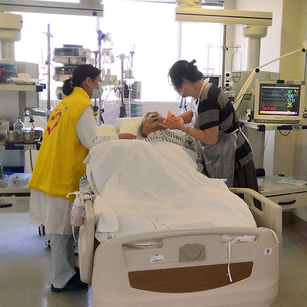 10床谭老是一名老红军,10月4日上午,谭老家属在志愿者带领下来到床边探望老人,老人因为气管切开不能说话,对家属也是一直不理不睬,志愿者温剑艺灵机一动,谭老是老红军,一定喜欢听国庆阅兵的事,于是跟家属一起为谭老讲述国庆阅兵的事,谭老一听顿时睁开眼睛,两眼直盯着志愿者和家属,脸上也露出久违的笑容。