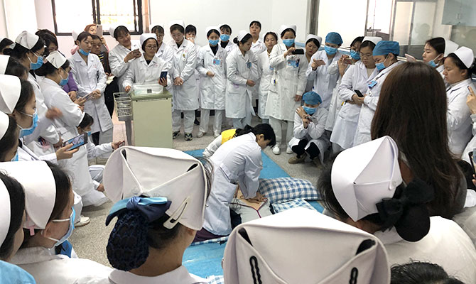 心肺复苏急救技能的演示及培训指导,当地医护们踊跃参与,进一步提高医护人员的基本急救能力。