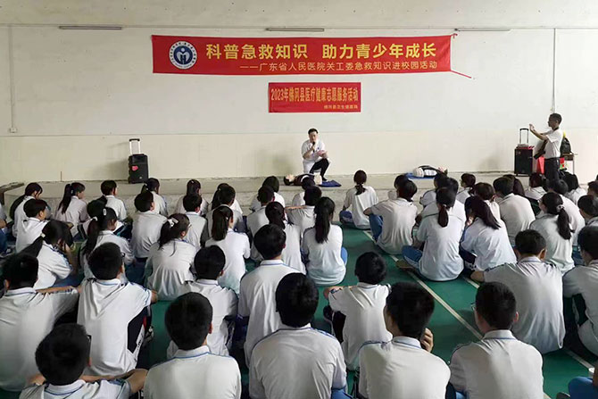 2023年5月下旬,佛冈县城北中学的校园里书声琅琅,在我院关工委(关心下一代工作委员会)和城北中学的组织下,急诊科李亚阳和翟桂霞两位心肺复苏团队成员在体育馆内为初中部200余名学生和老师进行急救技能科普。7月4-6日,应广州白云机场海关邀请,急诊科院前急救护理组长李苹和护士李亚阳为海关工作人员进行“心肺复苏与急救知识”的专题培训活动。7月19日,于我院医学模拟教育中心,急诊科普团队成员为我院职工子女进行一场特殊的急救培训,让孩子们参与模拟实施心肺复苏的操作,感受父母职业体验。希望他们可以追随父母的足迹,学习医学知识和急救技能,能像父母一样将健康带给更多的人。