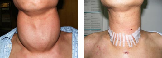 甲状腺疾病常见于女性,传统的甲状腺手术由于颈部留有手术瘢痕,切断皮神经导致术后颈部不适、感觉异常等,给女性患者造成很大的心理负担,一些爱美的女性患者希望在颈部完全看不到瘢痕,对美容效果提出了更高的要求。近年腔镜技术在许多领域取得了长足的发展,1997年Hussher等完成了首例腔镜甲状腺腺叶切除术,美容效果满意。随着腔镜甲状腺手术的不断发展,选择采用腔镜下的手术方式,将平时在颈部的手术切口改为在胸前很低的位置开三个小孔完成手术,从而满足这类患者的要求。我院血管甲状腺腹壁疝外科逐步开展了腔镜下甲状腺手术,取得良好效果,给甲状腺疾病患者一个新的选择。