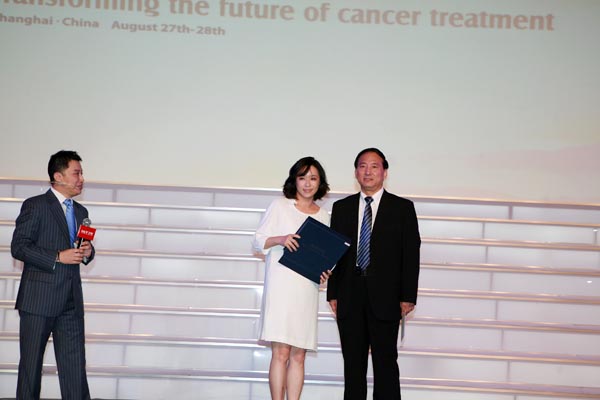 现任CSCO主席秦叔逵教授(右一)为廖宁主任(中)颁发奖项