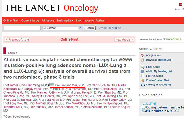 新年伊始,《新英格兰医学》发表了我院肺部肿瘤临床研究结果后,又传来了好消息——我院吴一龙教授牵头开展的国际多中心III期临床试验LUX-Lung 6的研究结果在《柳叶刀·肿瘤学》杂志上发表,影响因子25分。