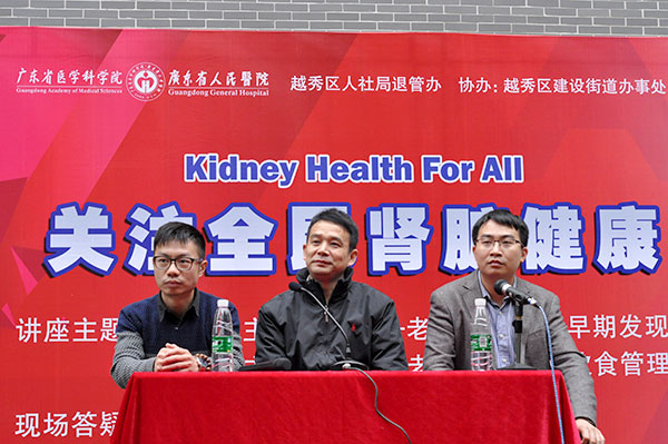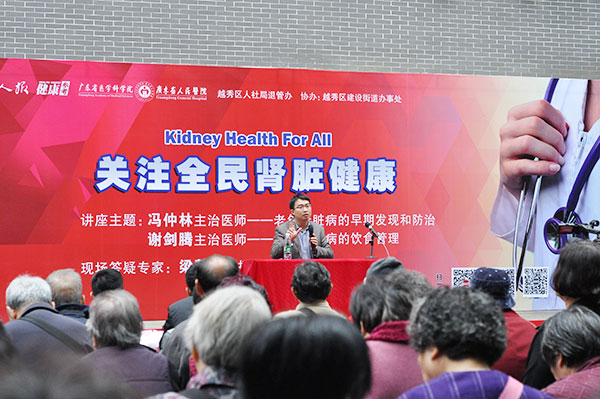 走入社区、重视基层,为群众提供权威科普知识,既能服务百姓健康,也提升了学科知晓度,是增强医患互信的良好渠道。在2015年“世界肾脏病日”来临之际,我院肾内科专家携手《老人报》走进居民社区,把讲堂开在了群众身边。3月11日上午在建设二马路社区的建设街文化站广场举办了“关注老年肾脏健康”健康讲堂,我院肾内科主任医师、博士生导师梁馨苓、王文健现场为肾病患者居民们解惑答疑,主治医师冯仲林、谢剑腾则进行了《老年肾病的早期发现和防治》及《老年肾脏病的饮食管理》的主题讲座。
