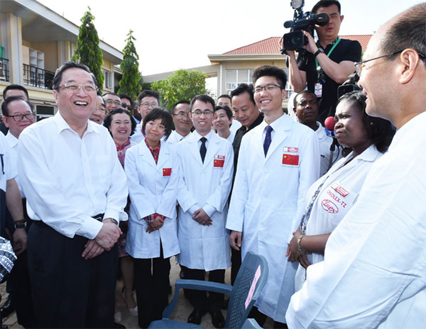 俞正声询问队员们的生活情况及工作条件,嘱咐队员们要注意好身体,改善生活。俞正声鼓励援非医务人员以出色的工作造福当地民众,弘扬中非友谊。