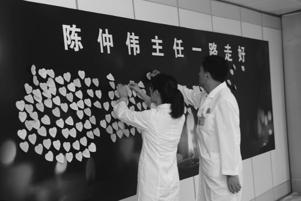 同时在省人民医院院内,因需要坚守岗位不能到殡仪馆的部分医护人员有的暂停下手中的工作集体默哀一分钟,有的赶到医院多功能厅放置的陈仲伟主任遗像前献上一枝素菊,用深深的哀思送别曾经的良师益友。告别人群中不乏被陈主任救治过的患者和素不相识的市民,大家神色凝重,掩面相泣,面对陈主任的遗像深深地鞠上一躬。