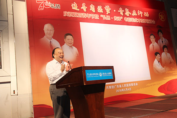 耿书记代表医院党委向广大青年致以节日的问候,并在大会致辞。他强调青年永远是祖国的未来和民族的希望,我院40岁以下青年有3300多人,可以说,“青年强则省医强”。他对广大青年提出三点要求:一要崇德修身、坚定信念。要踏踏实实修好公德、私德,坚守以救死扶伤和全心全意为患者服务为核心内容的精神信仰。二要传承医院优良文化。省医能够有今天的规模,靠的是几代省医人一步一个脚印打拼出来的。青年人要学习、传承老一辈省医人的干事创业精神,脚踏实地、立足岗位、刻苦学习、发奋工作。 三要敢于担当、扎实干事。今年医院的重点工作是“调结构、促转型、建高地”和“学科建设、人才培养、绩效管理、信息化建设”,4月份刚签订了托管南海二院的协议,不久珠海金湾医院将落成开业,接着将大力推进省医科院的建设,省医的发展蓝图已经初步凸现,这些都为青年们提供了广阔的成长成才空间。医院要营造这样一种文化氛围:让每一位省医人都看到希望,让想干事的有事干,让能干事的干成事。所以,只要青年们扎扎实实干事,踏踏实实做人,坚韧不拔、百折不挠,成功就一定在前方等着。