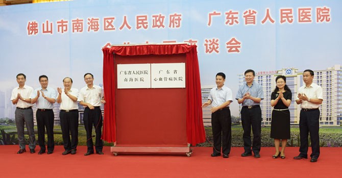 今日上午,佛山市南海区人民政府、广东省人民医院合作办医座谈会在南海迎宾馆迎宾厅隆重举行!广东省卫生计生委黄飞副主任,广东省人民医院庄建院长、耿庆山书记,佛山市委常委、常务副市长、南海区委黄志豪书记,佛山市政府王玲副市长,佛山市南海区政府郑灿儒区长,南海区委常委,桂城街道党工委罗坚华书记及广东省人民医院南海医院甘艺平院长共同为广东省人民医院南海医院、广东省心血管病医院挂牌。