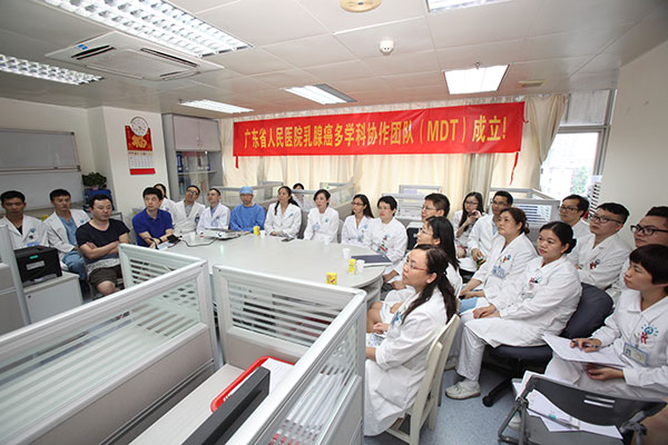 正式成立的乳腺癌MDT团队由乳腺科廖宁,病理科刘艳辉,放疗科潘焱及放射科刘春玲共同担任MDT团队共同主席,组员分别为乳腺科王坤,李学瑞,张国淳,祖建,病理科罗东兰,徐方平,放疗科曾子君以及放射科何晖及科室相关医生等。