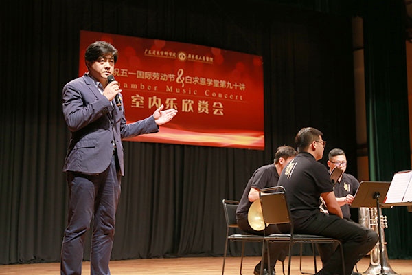 随后,活动第二个主题——白求恩学堂第九十讲室内乐欣赏会开讲。自2015年4月第一期学堂开讲以来,白求恩学堂不仅为职工传授专业知识,讲医患沟通、讲医院管理,更要为大家讲人文、讲生活,本次更把学堂开到了星海音乐厅,邀请了广州交响乐团的音乐家们为职工们讲授室内乐。