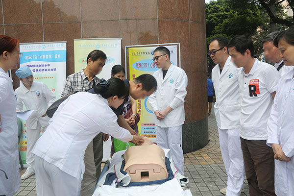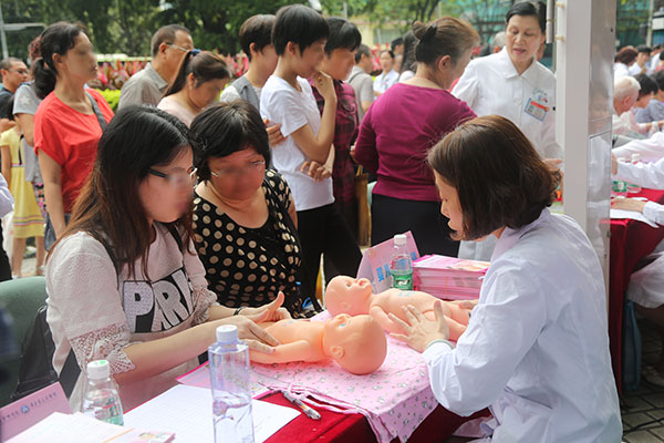 急救技能培训的现场更是火爆,一开始就被市民们围得水泄不通,后来在工作人员的指导下排起了有序的队伍。学习心肺复苏的市民们有许多是爷爷奶奶,有些父母带着小孩来参加。不管是老人还是孩童,他们学习起来都非常认真,在急诊及ICU专科护士的指导下,他们很快掌握了急救要领。