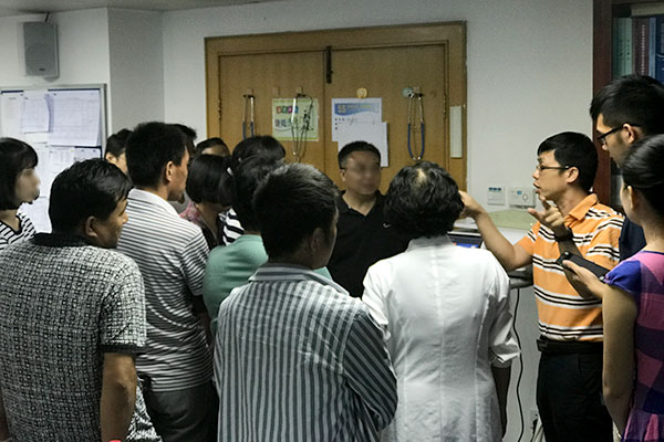 6月17日下午两点不到,近30名腹膜透析患者就陆陆续续来到我院门诊住院楼14楼肾内科医生办公室,一起参加腹膜透析中心举办的2017年腹透肾友会活动。此次肾友会活动的内容有腹膜炎的预防、腹膜透析患者饮食指导、数字化腹膜透析远程管理平台的演示以及肾友问题答疑环节。