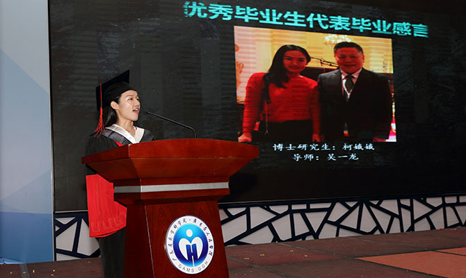 优秀毕业生代表柯娥娥发表感言,以“我的中国梦 立志·修身·博学·报国”为主题,讲述了五年硕博生活中的切身感受,表达了对医院、对导师悉心培育的感激之情,也对师弟师妹、毕业生和医院的美好未来送上了祝福。导师代表张智伟副所长从自身的经历跟导师们分享了研究生的培养经验及寄语研究生在未来的求知路孜孜不倦,业绩更上一层楼。最后代表全体导师对现场的毕业生表达了衷心的祝福以及殷切的希望。