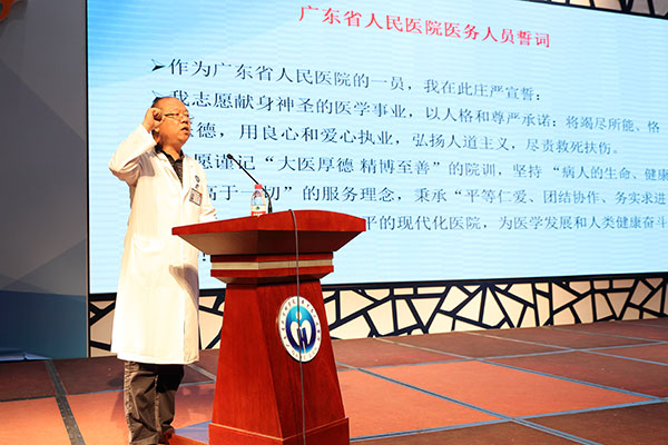 纪委书记严晋带领全体新员工庄严宣誓:作为广东省人民医院的一员,愿谨记“大医厚德 精博至善”的院训,为医学发展和人类健康奋斗终生!