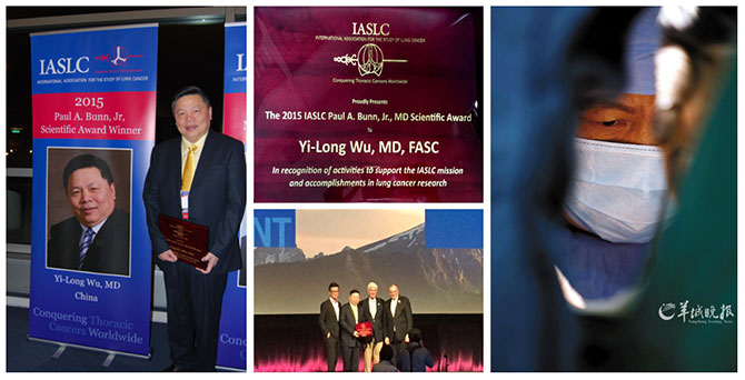 广东省肺癌研究所原所长吴一龙教授精于肺癌“精准医学”诊治及研究数十年,创立的“肺癌分子靶向精准治疗模式”和“肺癌纵隔淋巴结清扫术”已纳入我国《原发性肺癌诊疗规范》和《中国肺癌临床指南》以及英国、美国、德国、日本、欧洲等国家和地区制订的肺癌指南。吴教授被授予美国外科学院院士荣誉称号、国际肺癌研究协会(IASLC)理事会理事、IASLC国际肺癌分期委员会委员中来自中国唯一的一位专家委员,担任中国临床肿瘤学会(CSCO)理事长。吴一龙教授荣获2015年国际肺癌研究协会(IASLC)颁发的Paul Bunn Jr. Scientific Award (杰出科学奖),成为世界肺癌研究学会有史以来首位荣膺此奖的中国肿瘤临床科学家。此外,吴一龙教授还荣获了2015第十六届吴阶平-保罗•杨森医学药学奖(简称“吴杨奖”),并荣获全国五一劳动奖章等荣誉。研究成果获得2016年中华医学会中华医学科技奖一等奖和2017年国家科技进步奖二等奖。