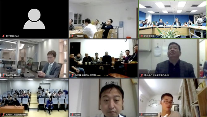 首届泛粤港澳胸部肿瘤云论坛于 12 月 13 日晚举行,会议以广州为主会场,由中国医学科学院肿瘤医院深圳医院牟巨伟教授、我院胸外科乔贵宾教授和湖南武汉大学人民医院宋启斌教授作为共同联合主席,我院胸外科周海榆教授作为会议执行主席主持网络云会议。