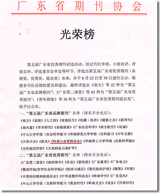 8月,在第五届广东省优秀期刊评选活动中传来佳讯,我院《岭南心血管病杂志》被评选为“第五届广东省品牌期刊”,成为其唯一入选的医学类杂志。