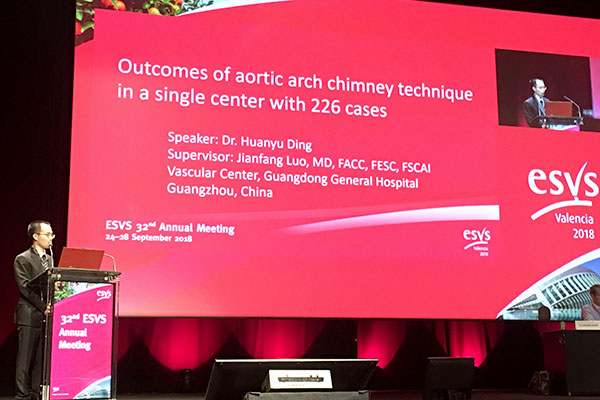 会上,丁焕宇医生及罗淞元医生以《Outcomes of aortic arch chimney technique in a single center with 226 cases》为题进行了发言,对中心应用腔内修复新技术--“烟囱”技术治疗主动脉弓部病变的随访结果进行了报道。“烟囱”技术自2012年8月在我院开展以来,已为200多名累及主动脉弓部的患者实现了全腔内修复,疗效确切,并可避免外科弓上血管重建,明显降低了住院时间及医疗费用。据了解,该研究是目前世界上所报道的应用“烟囱”技术进行主动脉疾病腔内修复最大的队列研究之一。研究全文已被European Journal of Vascular & Endovascular Surgery(JCR一区)收录。
