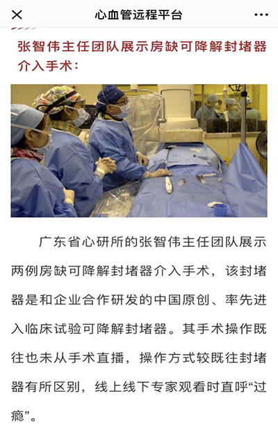 2010年,张智伟主任率先提出运用可降解材料替代传统金属材料制备封堵器的概念。迄今为止,国外虽有同类产品的研究,但并未进入临床试验阶段。张智伟主任团队携手先健科技的科研人员,在经过专利分析、原型设计、结构优化、实验室检测、动物实验等等一系列基础研究后,研制出新型“生物可降解房间隔缺损封堵系统”。其原材料聚左旋聚乳酸(PLLA)是经FDA批准的可降解高分子材料,具有良好的生物相容性,被广泛应用于心血管外科、骨科及整形外科等领域,在体内的最终降解产物为水和二氧化碳。
