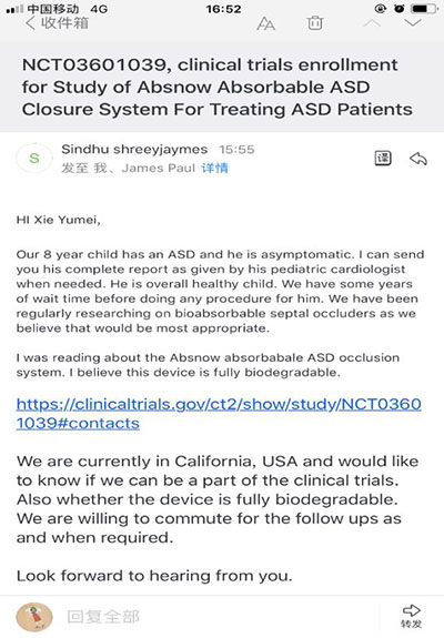目前“生物可降解房间隔缺损封堵系统”全国多中心临床试验已在国内10余家权威的结构性心脏病中心开展。由于该临床试验在国内和国外的网站上都有注册登记,动物试验的研究成果也先后在《Cardiology》《Catheterization_and_Cardiovascular_Interventions》等较有影响力的杂志上发表了原创性论文。在发稿前,谢育梅主任的邮箱收到了一位来自美国的8岁房间隔缺损患者的家长的邮件,因为孩子一直没有明显的临床症状,他们一直在等待,也一直在关注我们在可降解封堵器的研究结果。在国际注册网站上查到我院心儿科的可降解封堵器已经进入临床试验阶段,因此希望可以参加临床试验,使用新型可降解封堵器为他们的孩子进行介入治疗,并相信可降解封堵器是目前最适合治疗他们孩子的器械。
