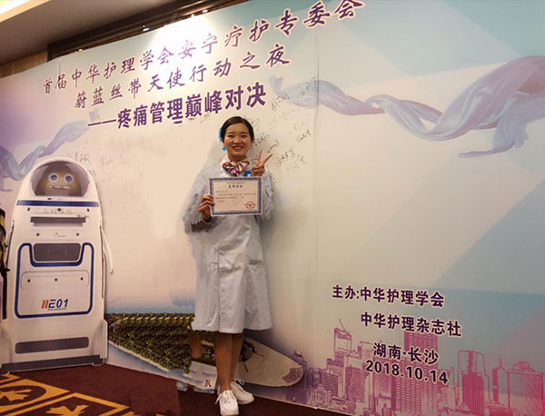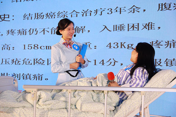 癌痛做为一个世界性难题,每天都在影响无数肿瘤患者的生活。癌痛全程管理模式是一个以肿瘤专科医护团队为主导的,充分调动患者积极性,医患共同参与,集癌痛动态评估、患者教育、规范化治疗、长期随访一体化的动态管理模式。护理在癌痛全程管理过程中担任着重要的角色,护理人员是癌痛管理当中最主要和最直接的先锋者、执行者和最富人文关怀的天使。比赛中,田杏随机抽取案例后,现场根据患者的演绎做作出准确判断,用专业幽默的语言和多媒体宣教方式对患者的进行全面筛查评估、爆发痛的处理、止痛药物不良反应的宣教以及院外随访,同时在关注患者镇痛治疗过程更关注到了患者心理健康,充分体现了对患者的人文关怀,赢得了现场评委和观众一致认可和热烈的掌声。