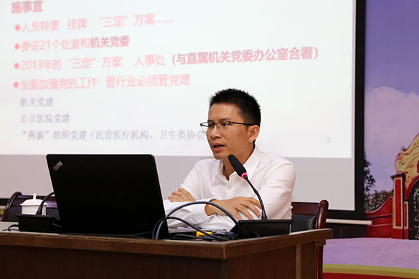 省卫生计生委党委办主任科员陈国文作《当前公立医院党建工作存在的主要问题和下一步重点解决的几个方面工作》讲座。陈主任结合省卫生计生委在今后一段时间内的重点工作,对如何促进党建与业务工作结合做了富有启示性的授课。