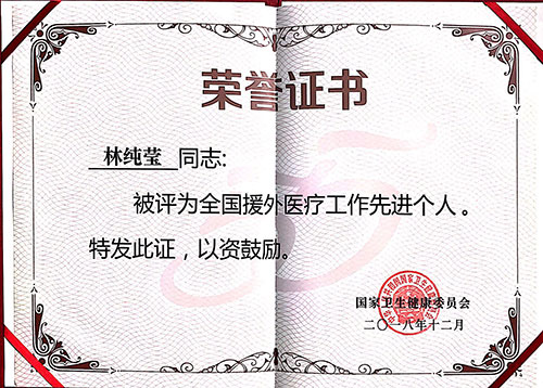 我院援外工作成绩显著,得到了国家、省委省政府和省卫健委的充分肯定和认可。广东省心血管病中心副主任、南海医院院长、党委书记、广东第二批援加纳医疗专家队队长林纯莹同志被评上全国医疗援外工作先进个人称号。12月17日在北京人民大会堂举行全国援外医疗工作先进集体和个人表彰活动,林纯莹代表全国先进做汇报。