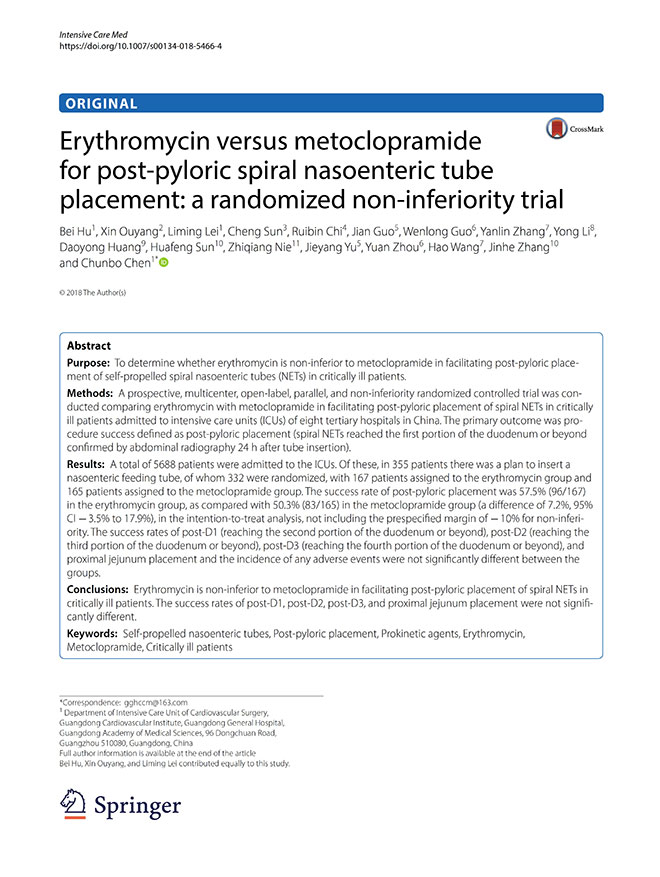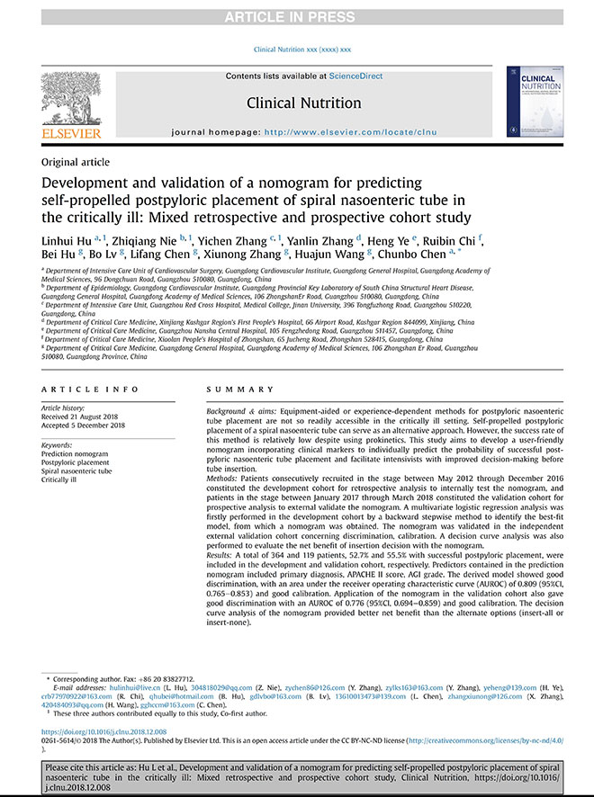 近日,我院重症医学陈纯波主任团队继促胃动力药辅助重症患者螺旋型鼻肠管幽门后置管的RCT研究《Erythromycin versus metoclopramide for post-pyloric spiral nasoenteric tube placement: a randomized non-inferiority trial》首登重症医学专业顶尖杂志《Intensive Care Medicine》(中科院一区,IF=15.008)后,短短一个月时间内再下一城。该团队题为《Development and Validation of a Nomogram for Predicting Self-propelled Postpyloric Placement of Spiral Nasoenteric Tube in the Critically Ill: Mixed Retrospective and Prospective Cohort Study》的研究成果以“Full Length Article”形式被营养学专业顶尖杂志——欧洲临床营养和代谢学会(ESPEN)的官方杂志《Clinical Nutrition》(中科院一区,IF=5.496)接收并正式在线。该研究着眼于重症患者螺旋型鼻肠管幽门后置管可视化预测模型的建立与验证,研究通过多元逻辑回归分析,建立并验证了影响重症患者置管成败的预测模型,最后可视化为简单易算的Nomogram,明显优化了临床医师在置管前的决策,避免了不必要的失败置管尝试,有助于重症患者及早获得安全、有效的肠内营养支持途径。该论文的共同第一作者为胡林辉硕士(华南理工大学医学院)、聂志强主治医师和张一臣硕士(南方医科大学),通讯作者为陈纯波主任,我院是论文的第一作者与通讯作者单位。